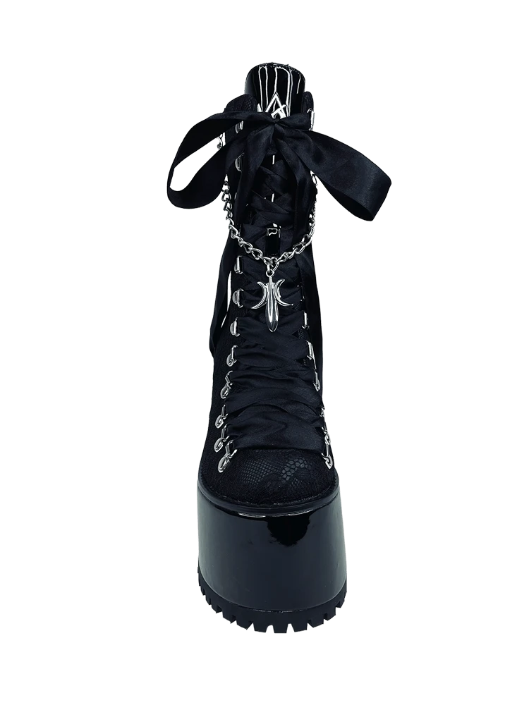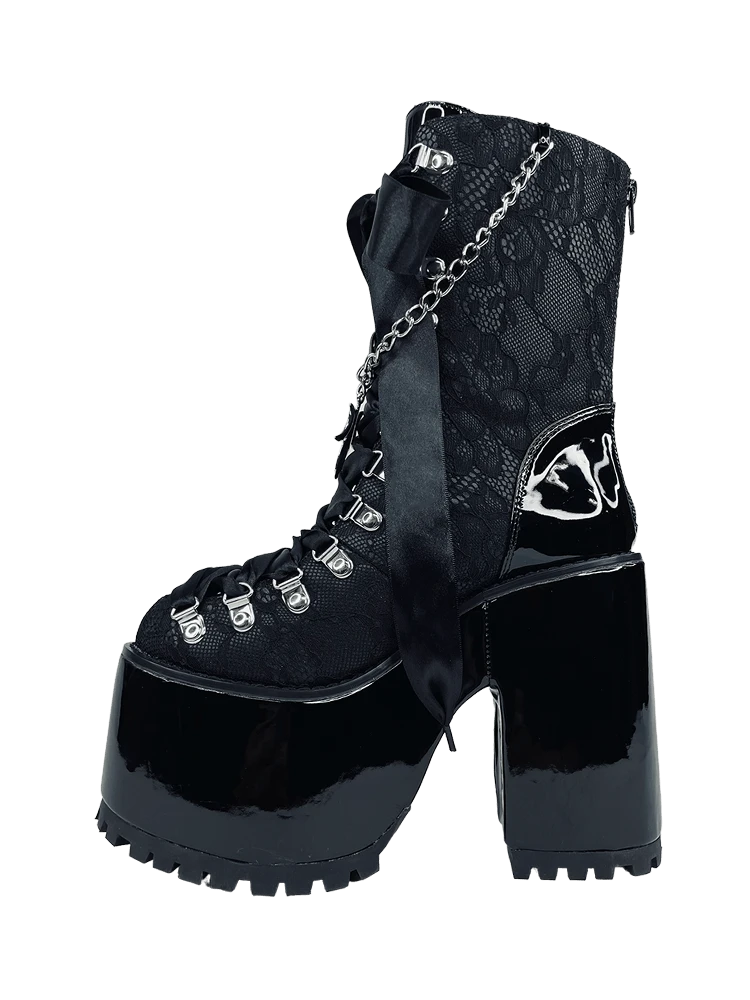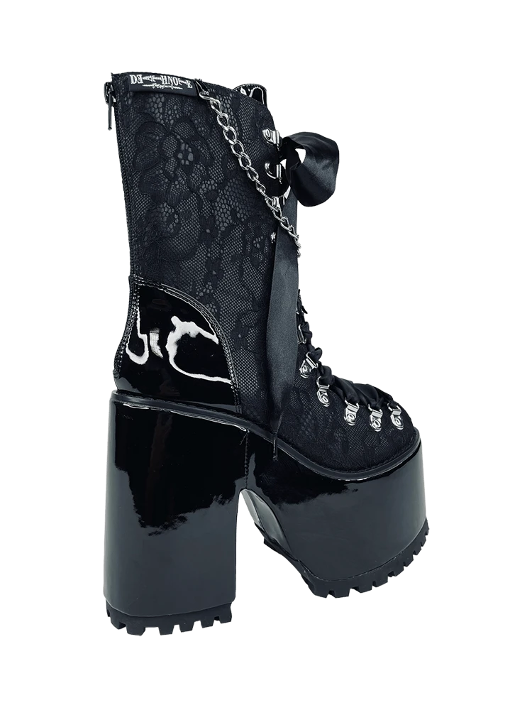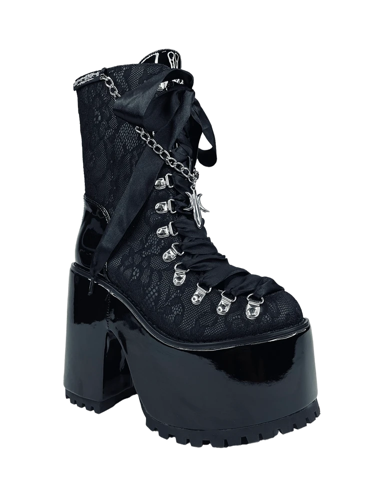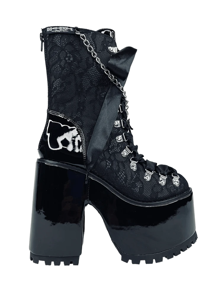 Death Note’s Misa boot is here. It has black lace upper, black satin laces, and a silver Fleur de Lis chain detail. There is a 3 and 1/4 inch platform, 5 and 1/2 inch heel, with black vegan patent leather wrapped bottom, and a black rubber outsole.Â