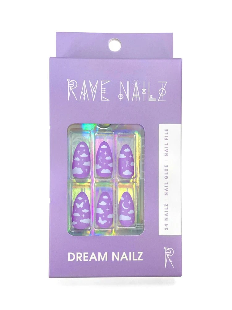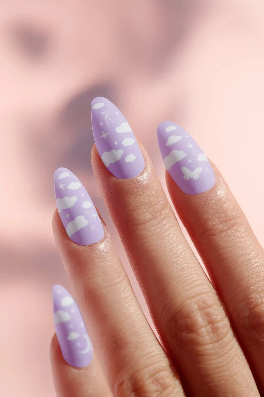 The Dream Nailz are short stiletto, matte pastel lavender press on nails with white ethereal designs all over. These cloudy fake nails are easy to apply and have a salon-quality finish. Take us to heaven, angel.