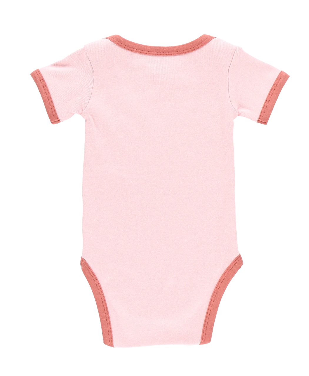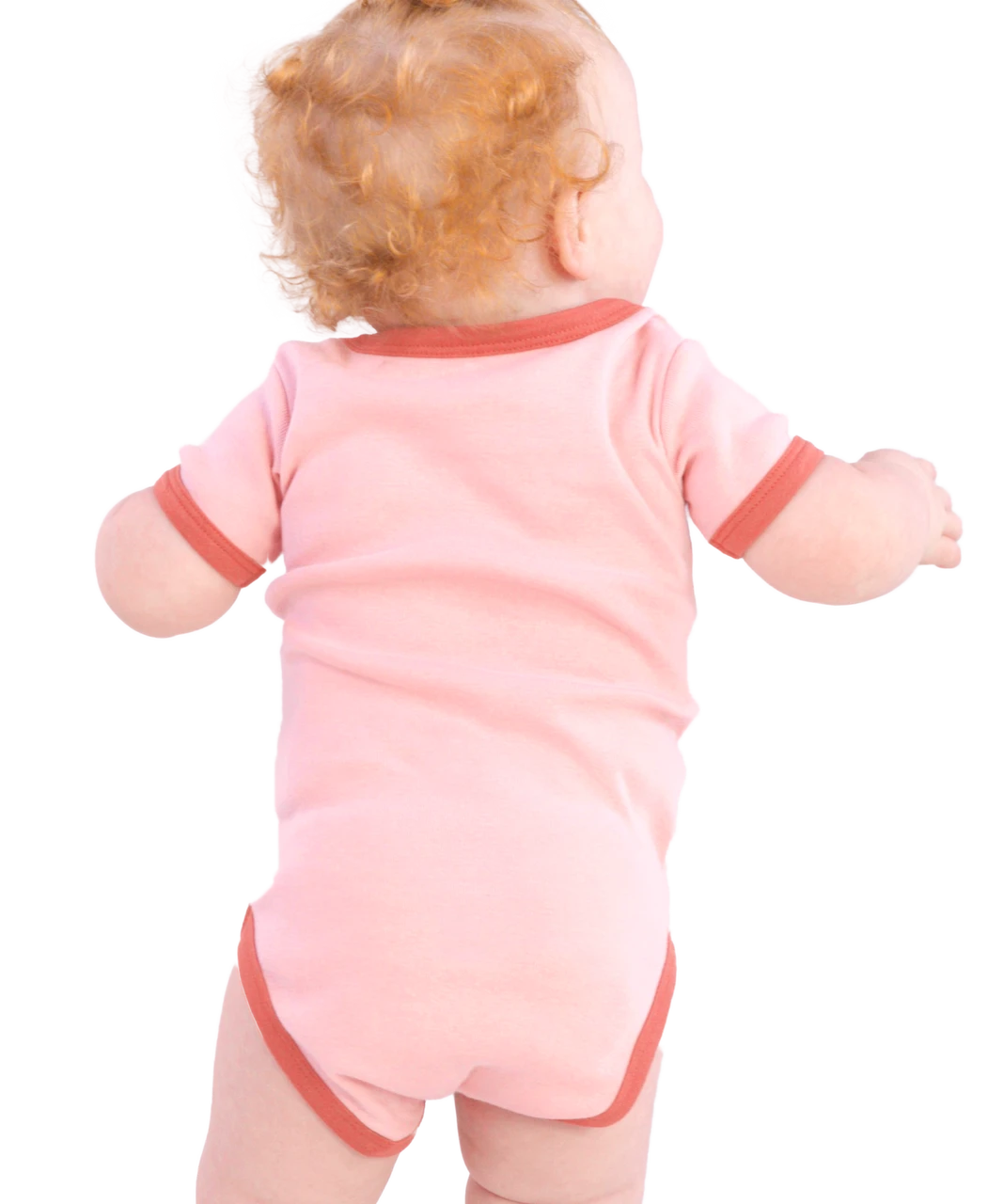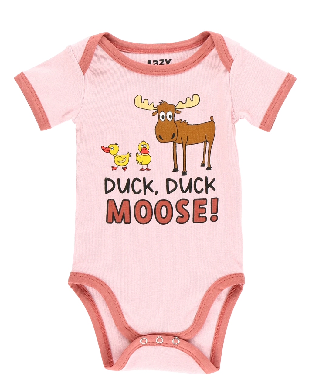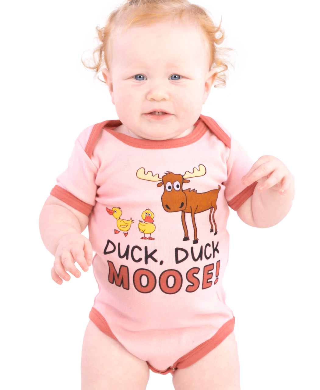 Add some fun and smiles to your little one’s wardrobe with our Duck Duck Moose Pink infant onesie. This onesie features a cute duck and moose design. Our infant creeper onesie are made with ribbed cotton for stretch, your child will have lots of room to move around! With snaps at the crotch and shoulder flaps for easy changes!