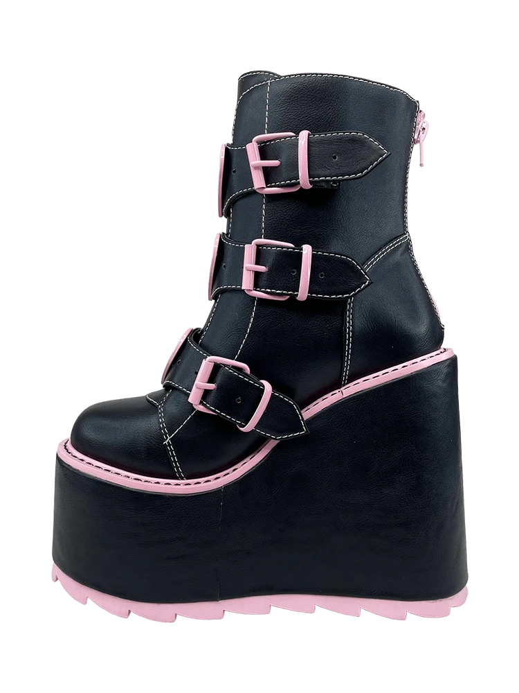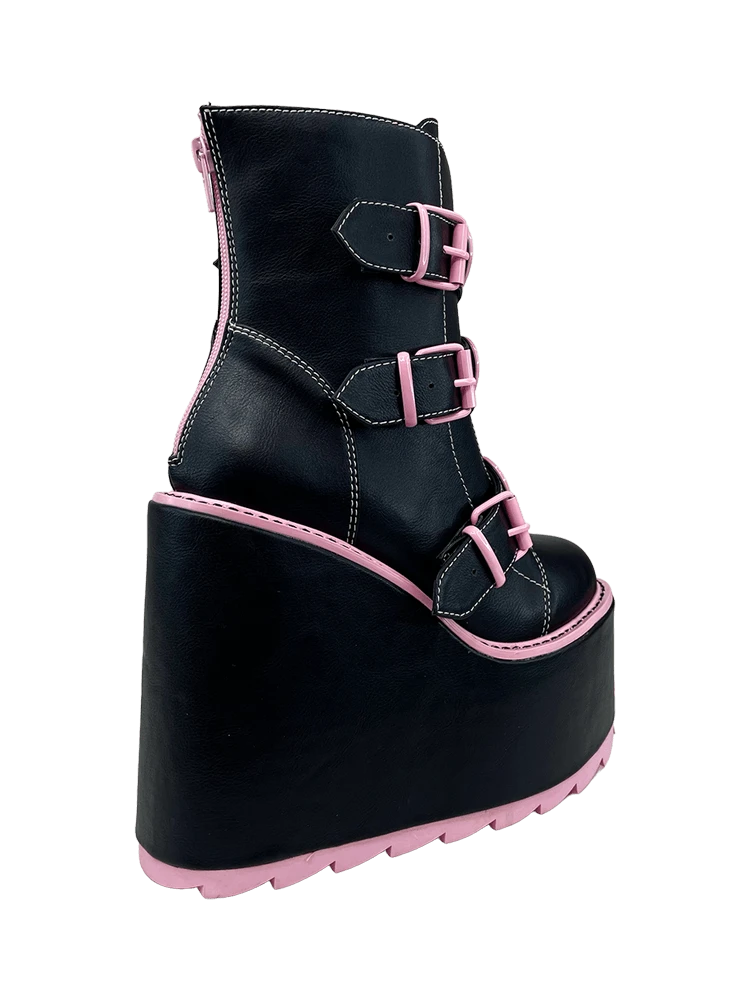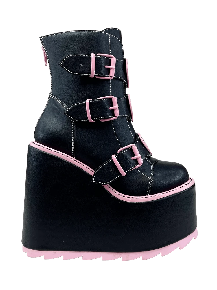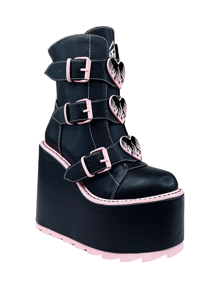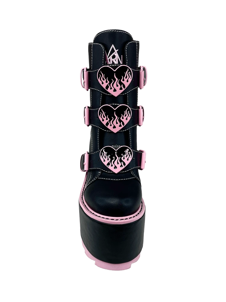 The Dune Lo Hearts on Fire has vegan leather upper, black and pink enamel flame heart charms, with pink enamel buckles and hardware. The bottom is vegan leather wrapped EVA, and has a 3 inch platform, and 6 inch heel.