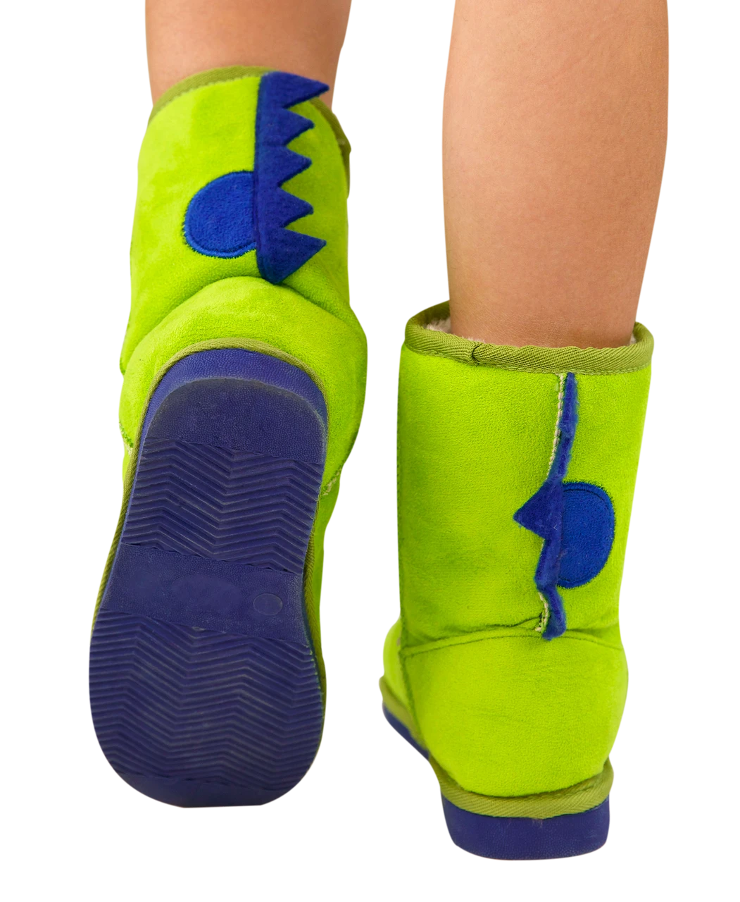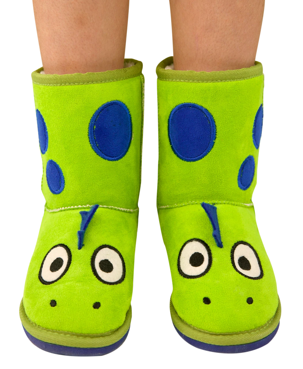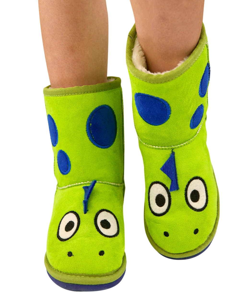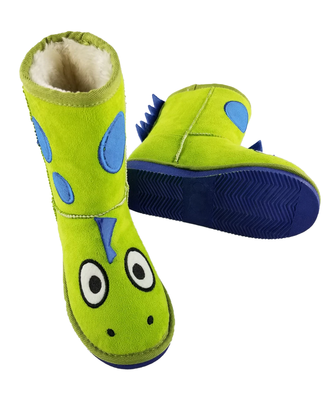 Your little one will be ready to stomp all over the place in our Dino Toasty Toez! Slippers with real character, our Toasty Toez live up to their name with a warm, fuzzy fleece lining on the inside, a stylish faux suede on the outside, and flexible rubber soles. Lets see some big rawrs! Sold Individually per size and design