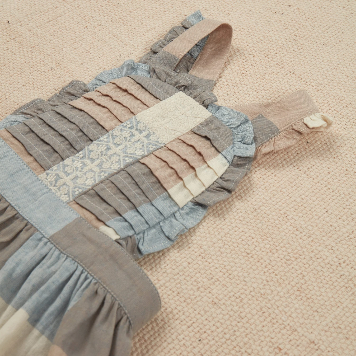 Lena is a favourite Apolina style, a pretty yet practical midi length pini. Cut from our specially woven blanket check in the misty blue, beige and cream tones. Lena’s sweet bib features pleating and a folk-inspired embroidery detail. Featuring elasticated back waist with adjustable button straps. Lena is perfect to layer up or down throughout the seasons.