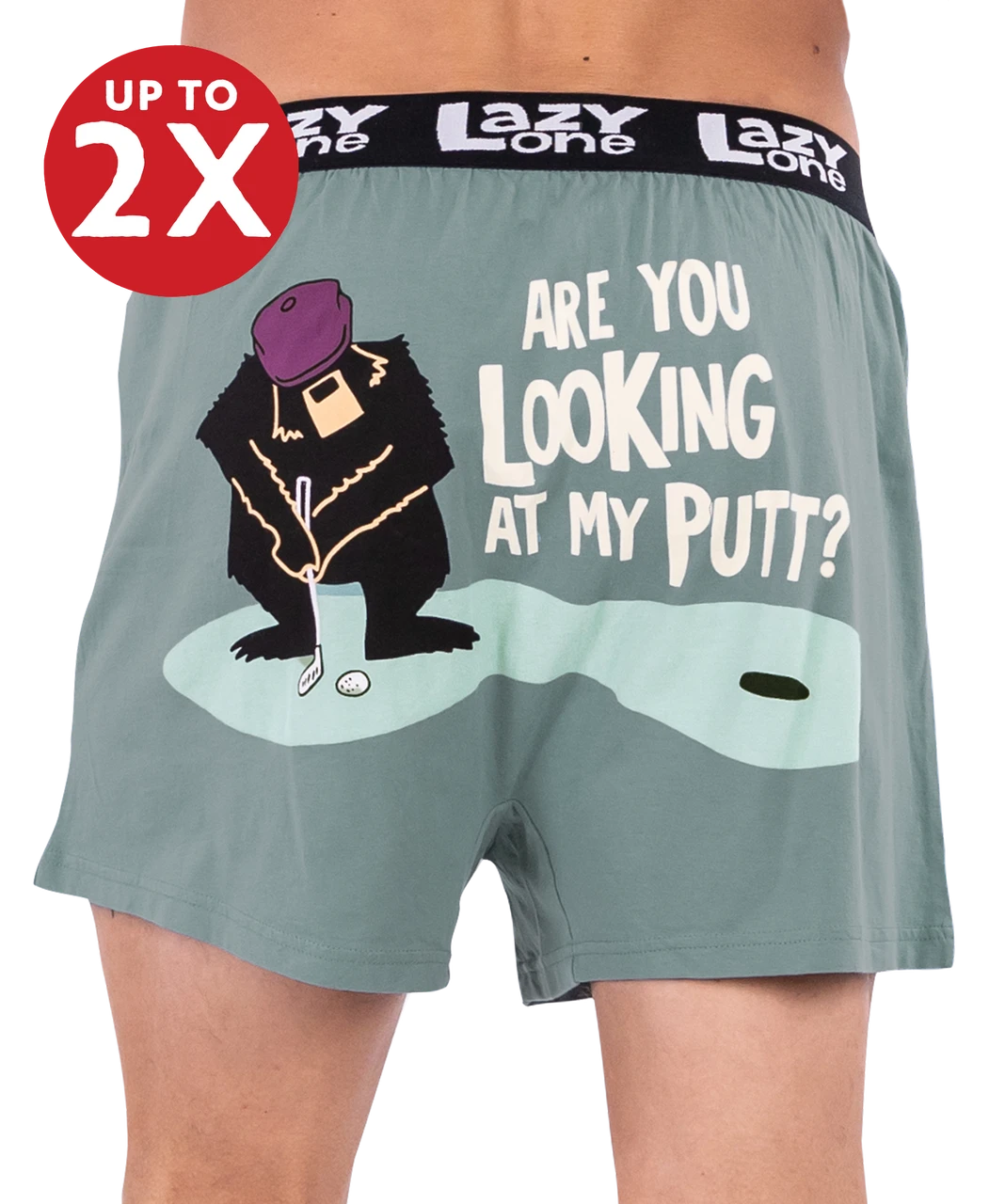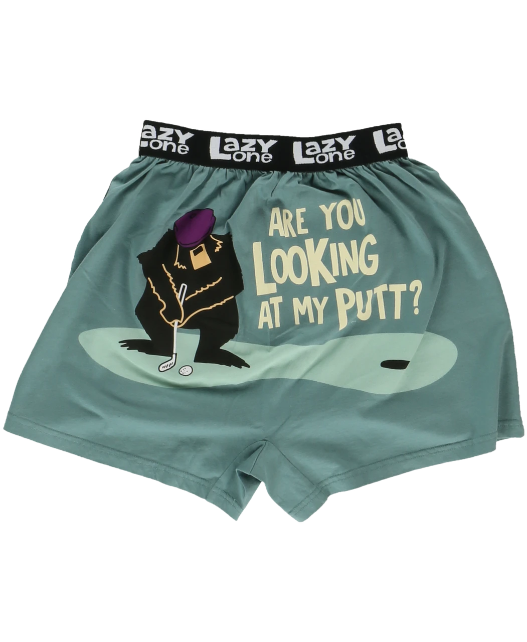 Have a superstitious golfer in your family? Our Looking at my Putt Boxer is perfect for any golf lover in your life! Made from soft 100% combed cotton knit, our boxers have a roomy fit with a button fly and an exposed elastic band. It’s easy to see why the butt stops here even if you are looking at it.