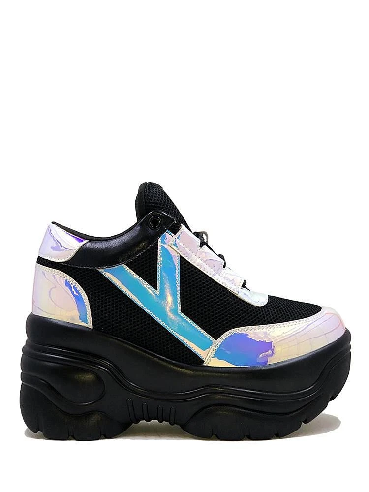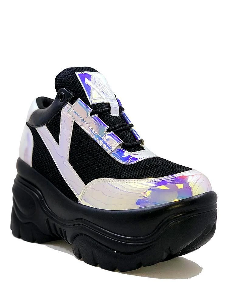 Chunky sneakers inside the MATRIXX. Bending reality in atlantis and black. This cosmic sneaker has black mesh details, made with PU upper. The outside platform bottom is 3 1/2 inches, whith round waxed cotton laces, and a tri-blend cootn/nylon padded lining.