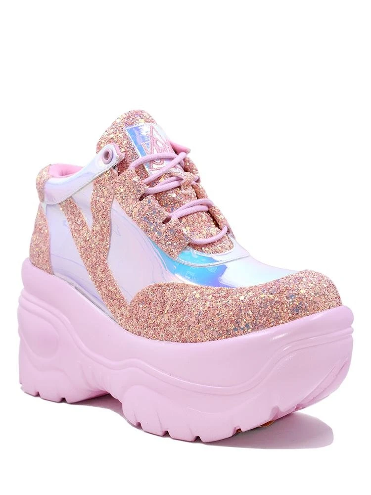 Chunky sneakers inside the MATRIXX. Bending reality in pastel Atlantis and pink glitter. This cosmic sneaker has pink glitter details, made with PU upper. The outside platform bottom is 3 1/2 inches, with round waxed cotton laces, and a tri-blend cotton/nylon padded lining.