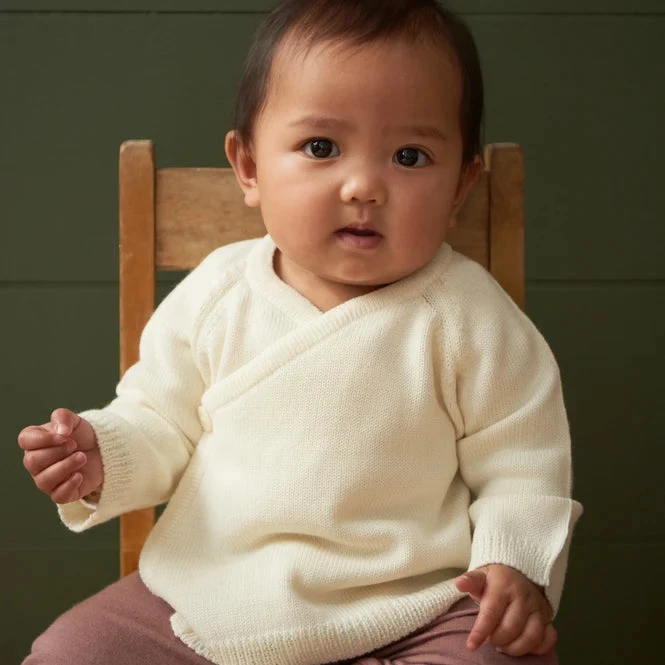 A timeless unisex merino wool knitted kimono. Designed as a perfect garment for newborns, these jackets are a great extra layer for a baby in their first few months. A wrap around style with a sweet button detail to close the jacket enables easy dressing for newborn babies. This is such a practical baby item that will match everything. The perfect piece to carry with you throughout the day.