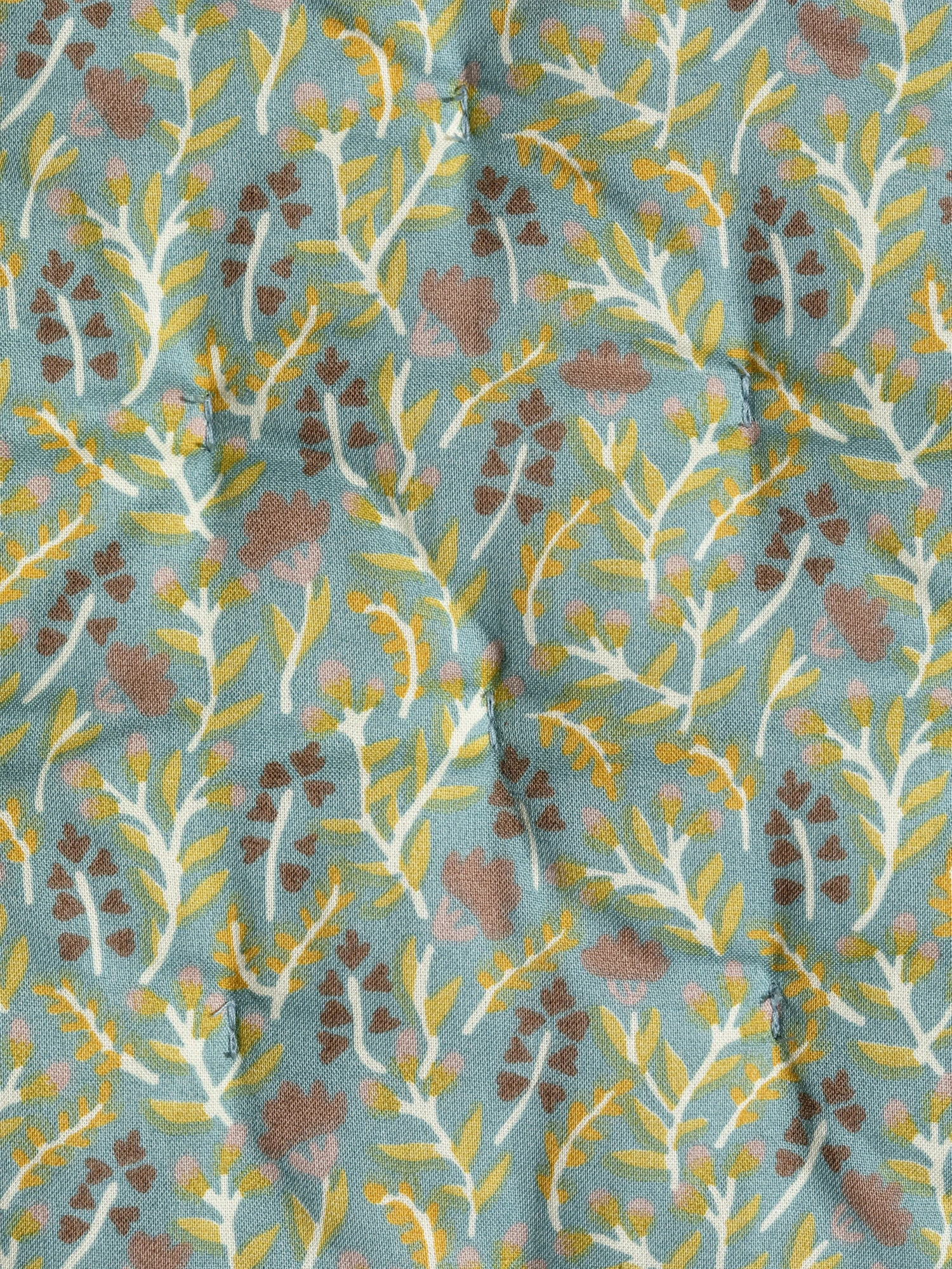 Soft quilted purse in lovely Geranium print with hand drawn flowers and shades of yellow, dusty orange, pale brown and misty blue. Great for storage of any small things.Â