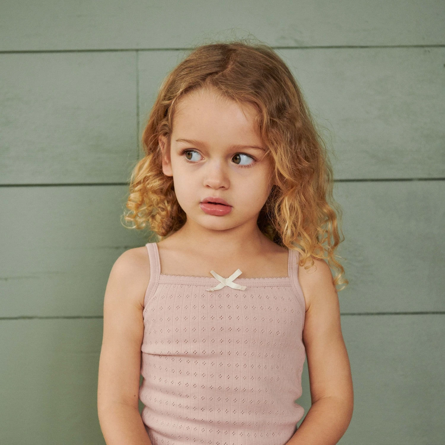 A beautifully sweet camisole made in beautiful pointelle fabric. Has a nostalgic quality and is super soft and stretchy. Almost too cute to wear as underwear! Features picot stitching detail along the front.