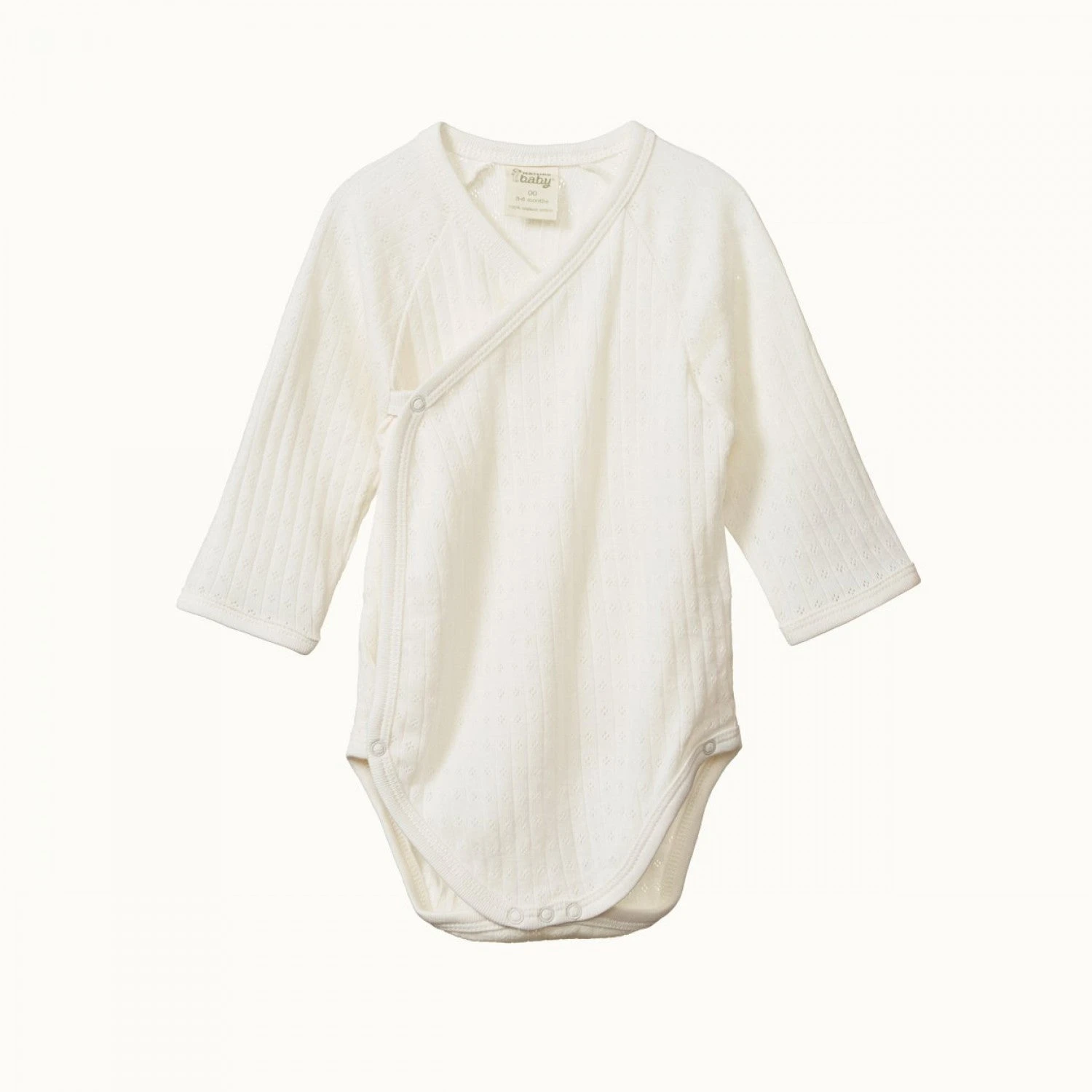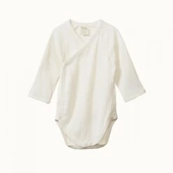 A great option for newborns to avoid having to pull garments over baby’s head. Long raglan sleeves and a wrap-around style with a double layer at the front to keep baby’s chest warm.