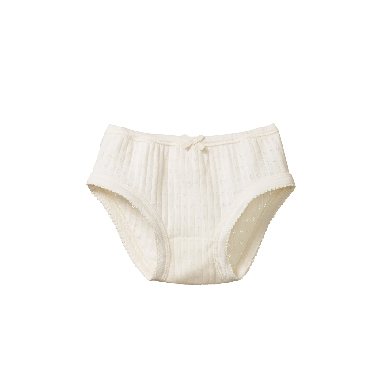 A classic style under pant in beautiful organic cotton pointelle fabric. The delicate open weave has a nostalgic quality and is super soft and stretchy. Comfortable with a soft elastic waistband, cotton picot stitching around legs and a sweet bow at waist.