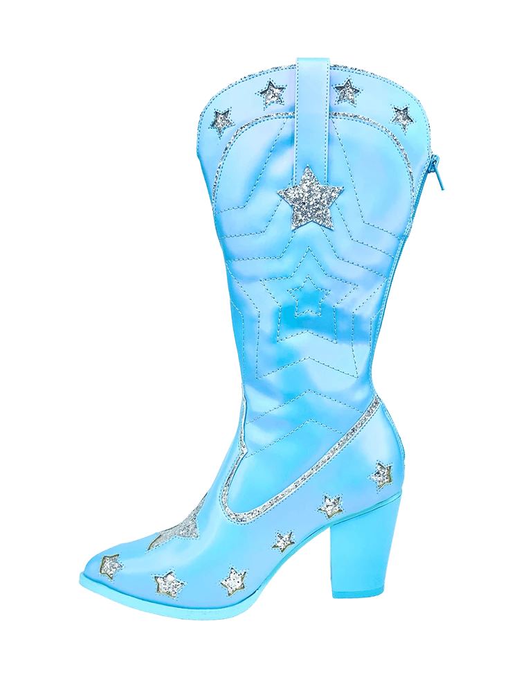Direct from space, the space cowgirl star has pearl blue vegan leather upper, with silver glitter details. There is a back zipper, with blue rubber outsole, a blue shiny heel, and silver glitter details.