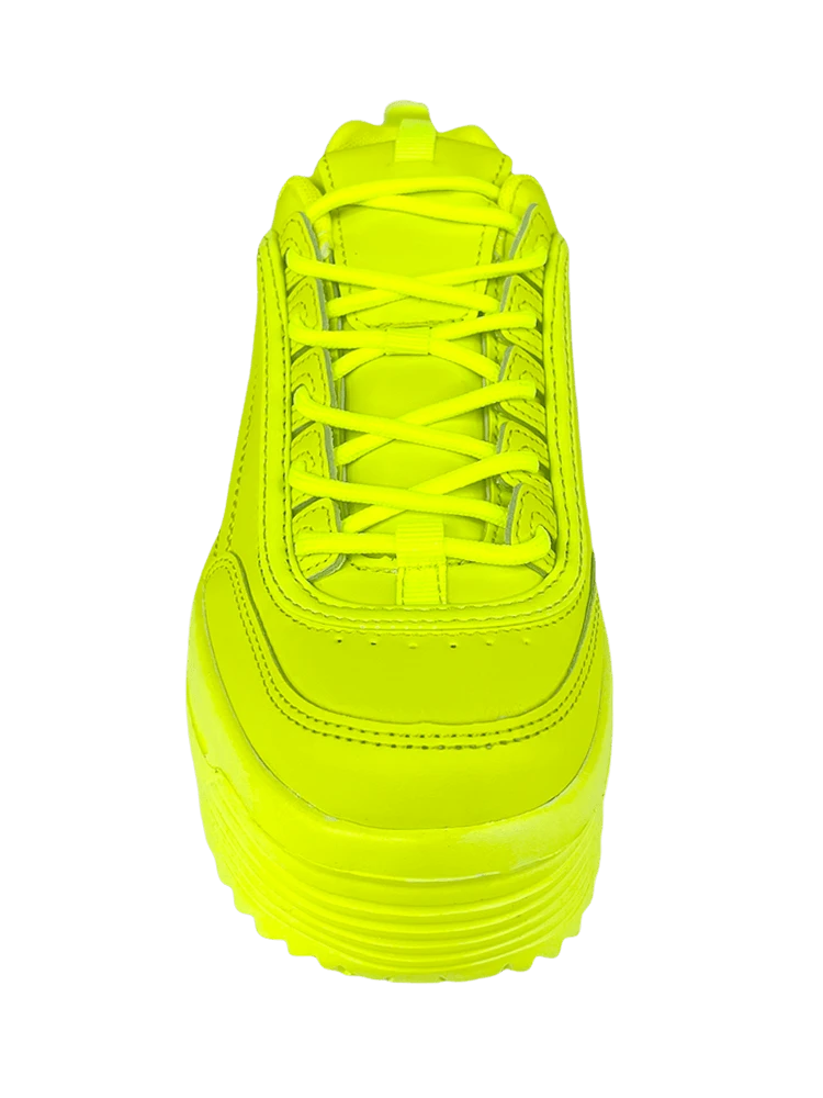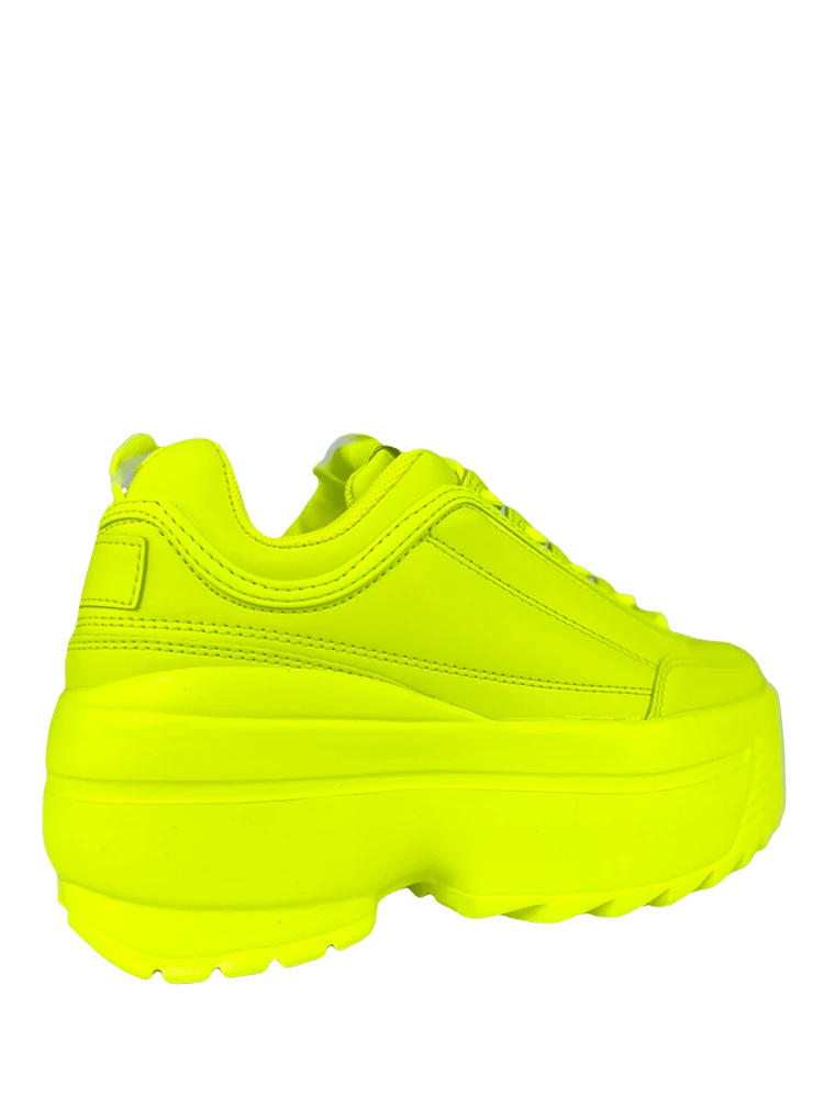 Neon yellow faux/pu leather upper with matching neon yellow tricot lining, and matching rubber outsole.Â